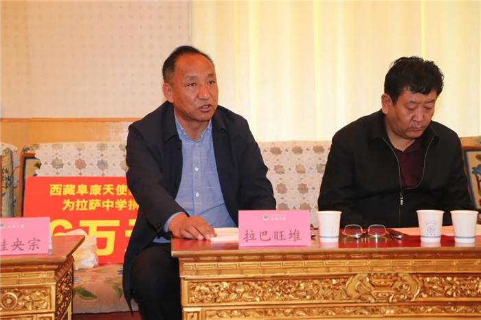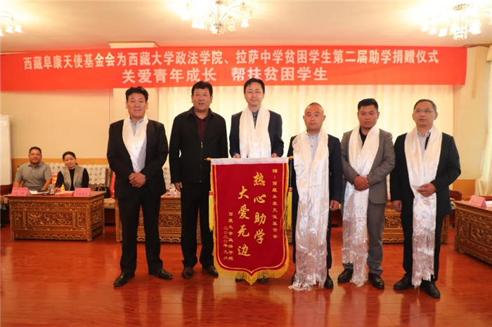 西藏大學政法學院黨委副書記達娃央宗主持捐贈儀式。西藏天使基金會副理事長劉連福宣讀了接受資助的學生名單,西藏大學政法學院黨委書記羅布、拉薩中學副校長拉巴旺堆代表受資助學生接受了捐贈,羅布書記代表政法學院向阜康天使基金會贈送了錦旗。
